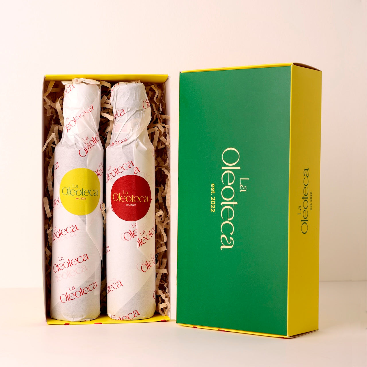 Perfecta para sorprender, esta caja incluye dos botellas de aceite de oliva de 250 ml, seleccionadas especialmente por nuestras catadoras para quedar como rey o reina con tu regalo de amigo secreto, cumpleaños, agradecimiento o cuando tienes que llegar con algo a una comida.